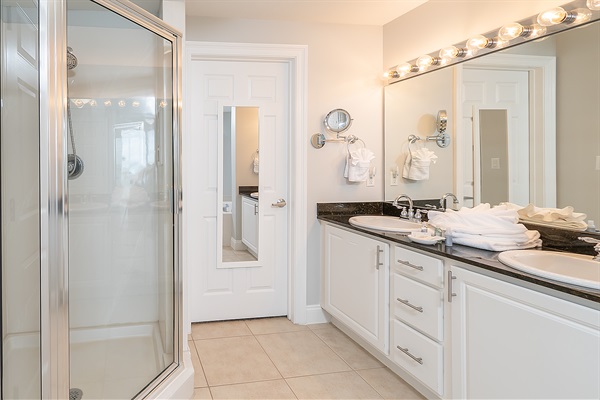 Primary Bathroom with double sinks and walk-in shower